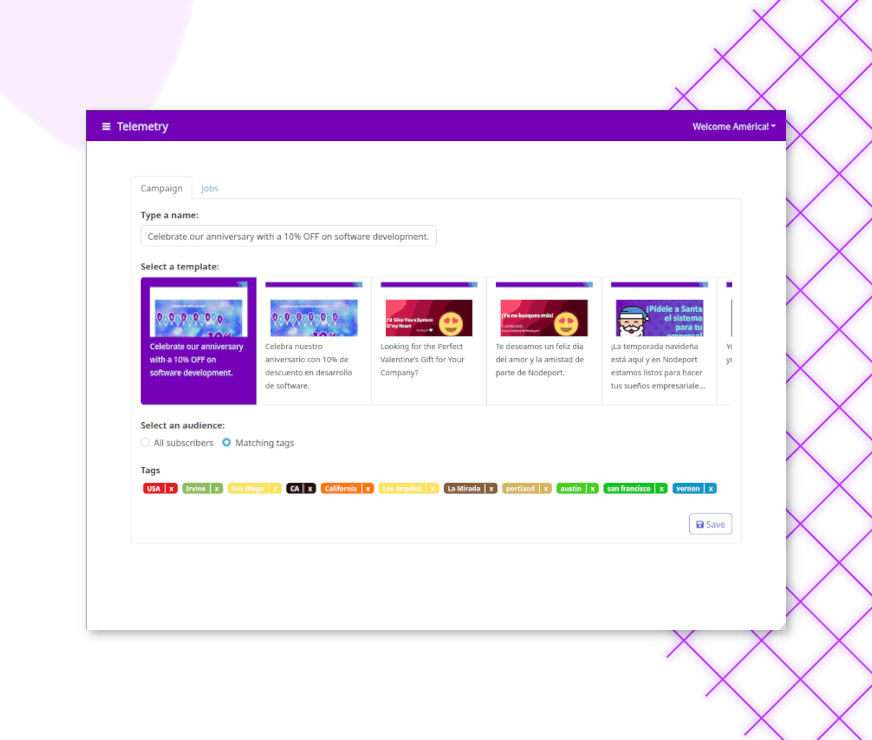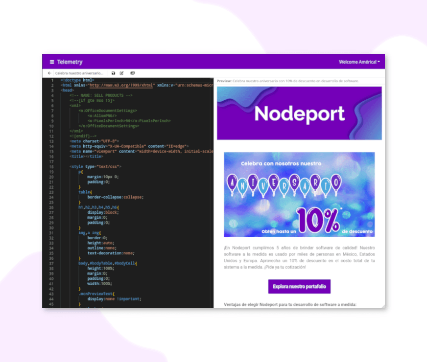 Simplifica tus estrategias de Marketing con nuestra plataforma de automatización de correos. Con Nodeport Telemetry toma el control de tu estrategia de adquisición de clientes. Encuentra clientes potenciales con nuestra integración de Google Maps y alcanza clientes potenciales directamente en su inbox. Diseña correos fácilmente con nuestro editor WYSIWYG, diseñador con Inteligencia Artificial y comunícate con tus clientes de una manera más efectiva. Con nuestra API puedes sincronizar tus contactos, enviar correos e integrar Telemetry fácilmente con tu solución de e-commerce. Se integra fácilmente con Postmark o toma el control de tus datos utilizando tus propios servidores SMTP.